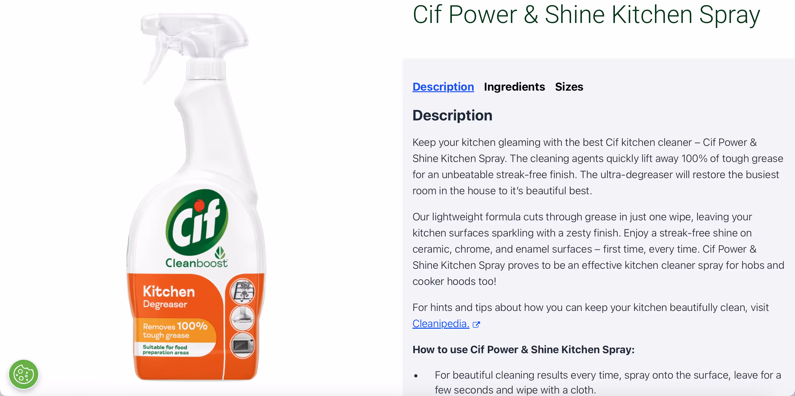 Brand Example: "The new Cif Power & Shine Kitchen spray cuts through the toughest grease in seconds, restoring your kitchen's sparkle without scratching."
